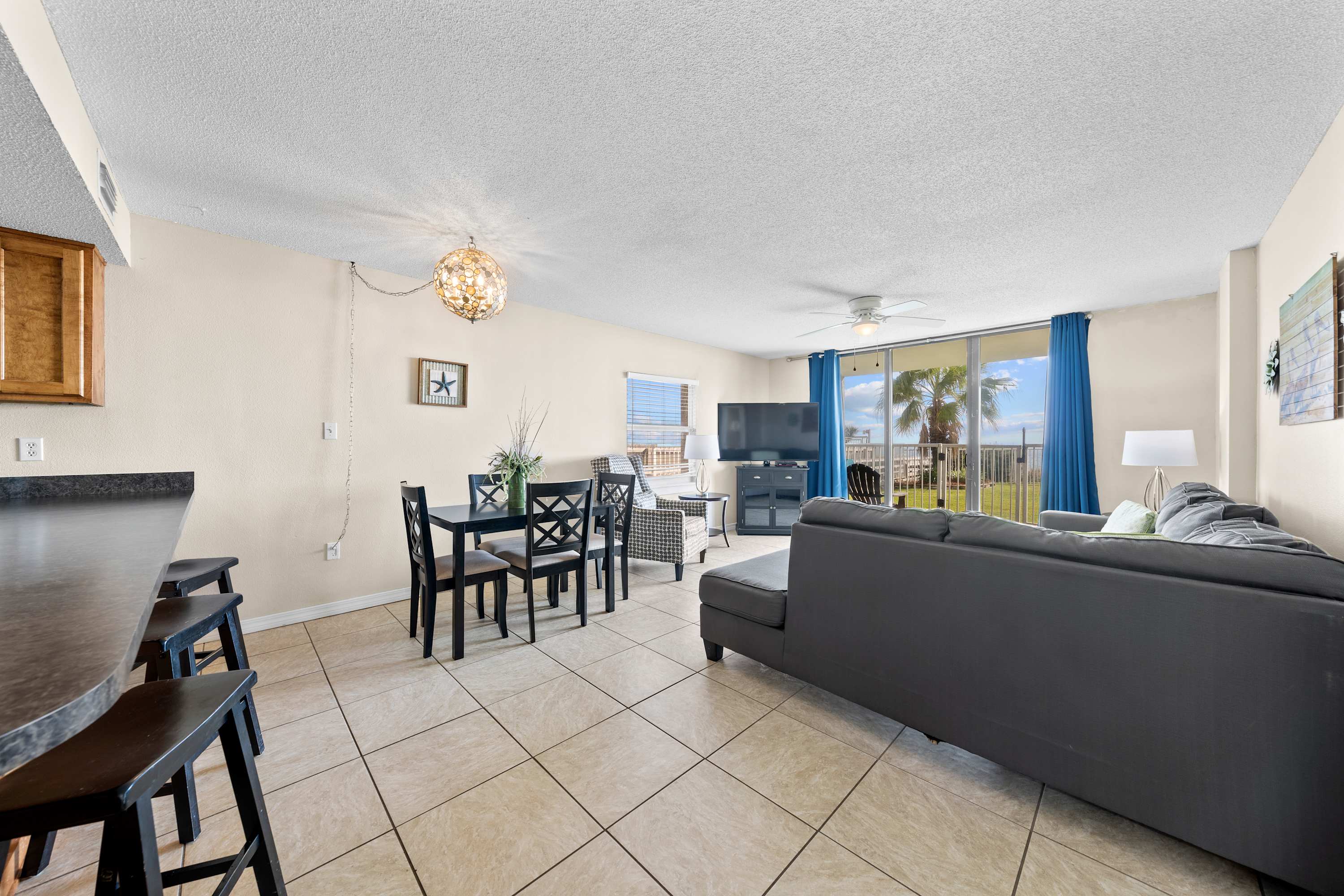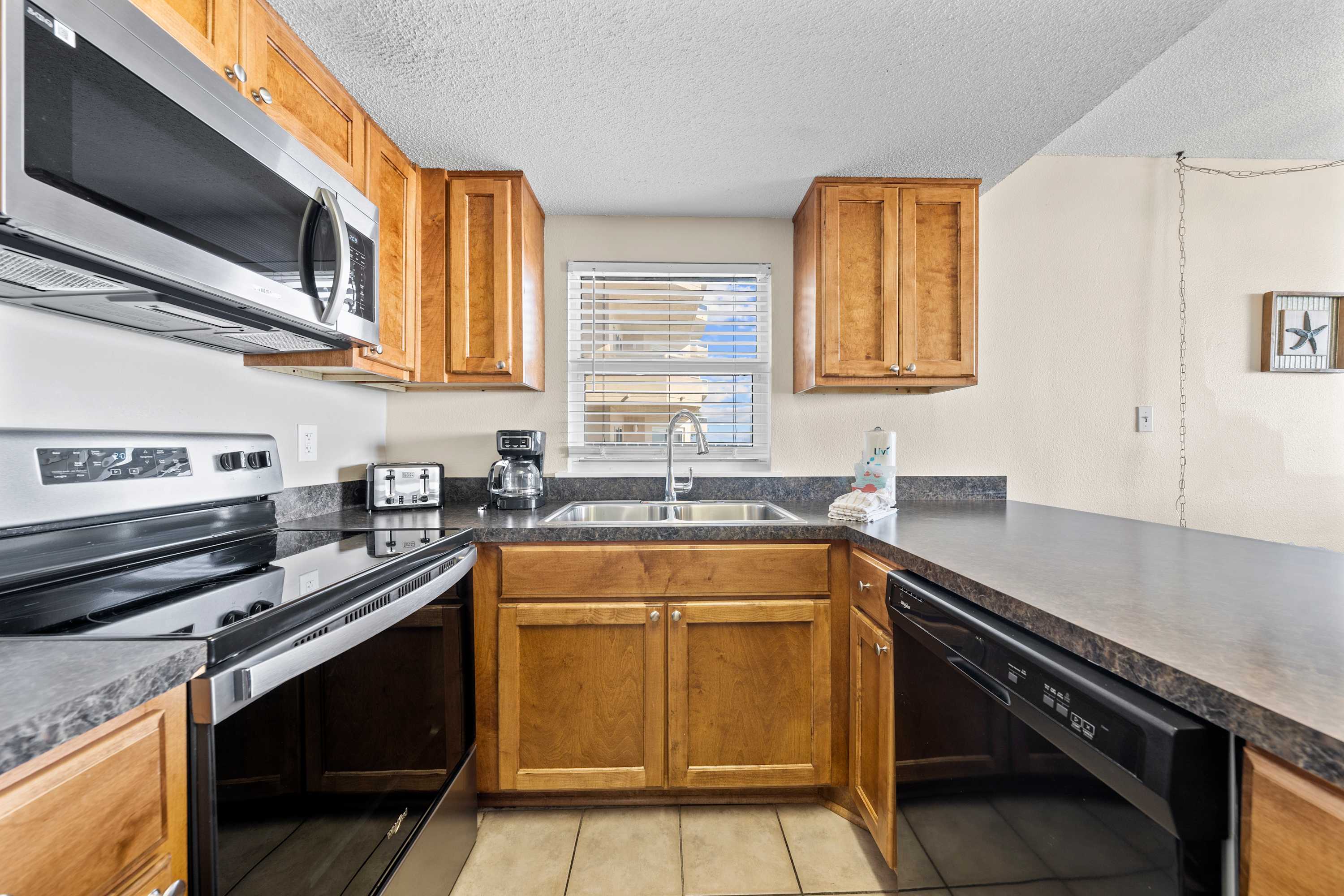 The living area is all about easygoing comfort, with a plush sectional, beachy decor, and huge windows letting in plenty of sunshine. Slide open the patio doors, and boom—you’re steps from the sand. The fully stocked kitchen makes it easy to whip up a quick snack or a seafood feast, with modern appliances, warm wood cabinets, and a spacious breakfast bar for gathering around.