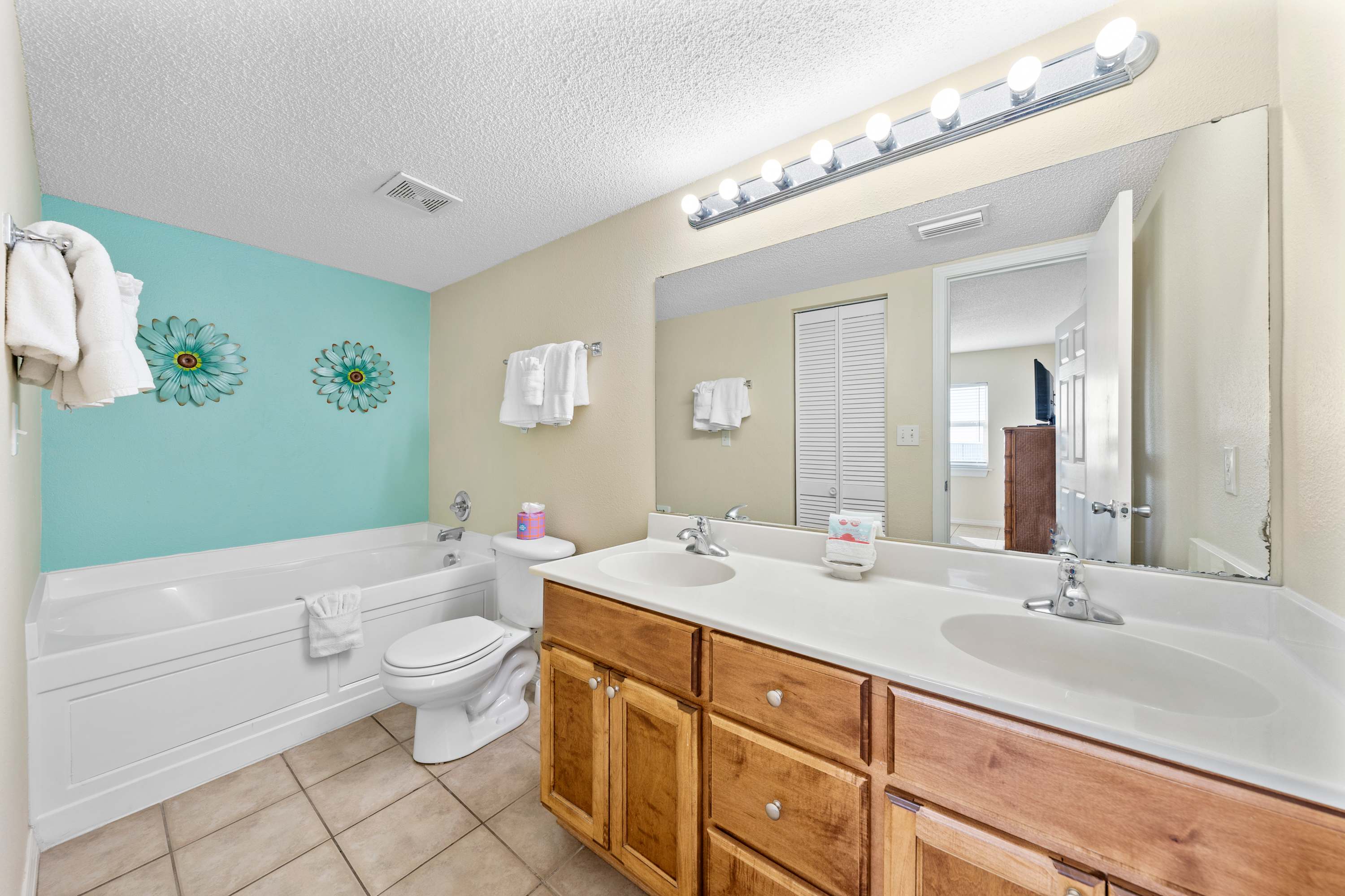 The primary suite is a total retreat, featuring a king bed, rattan furnishings, and a cool, coastal color palette that keeps the chill vibes flowing. The second bedroom has a queen bed and coral-inspired decor, perfect for kicking back after a long day in the waves. The third bedroom is all about fun, with two twin beds and nautical touches that make it a great hangout for the little groms. Each bedroom has its own private bath, so there’s no waiting in line when it’s time to rinse off the salt and sand.