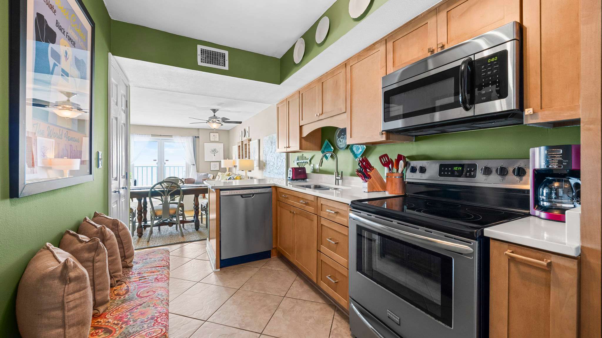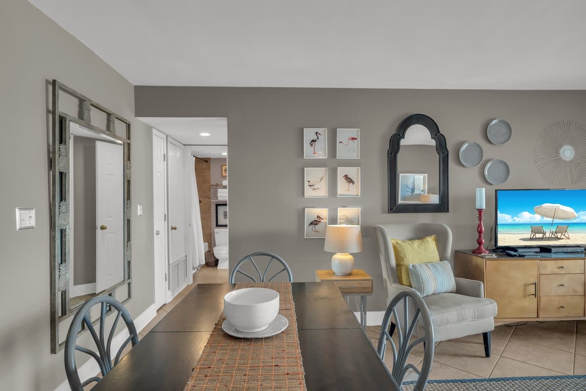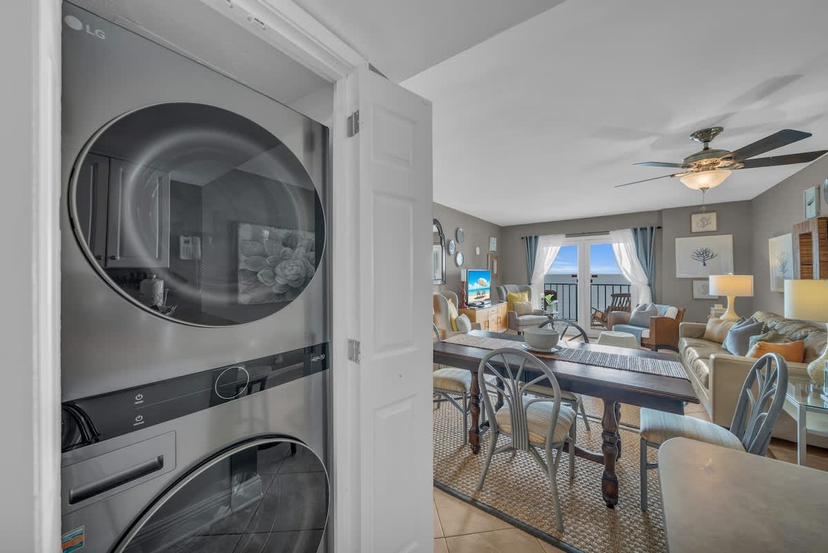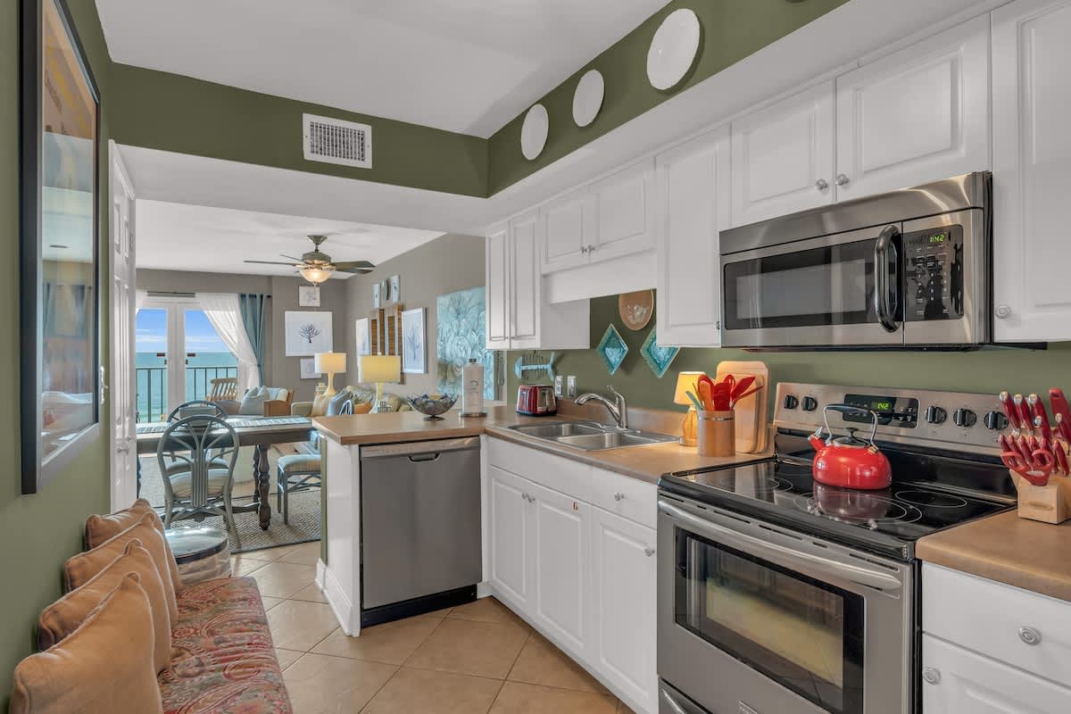 The living room invites you to unwind with comfortable seating, a large flat-screen TV, and direct access to a private Gulf-front balcony where you can sip your morning coffee while watching the waves roll in. The fully equipped kitchen has everything you need to prepare fresh seafood dinners or quick snacks between beach trips.