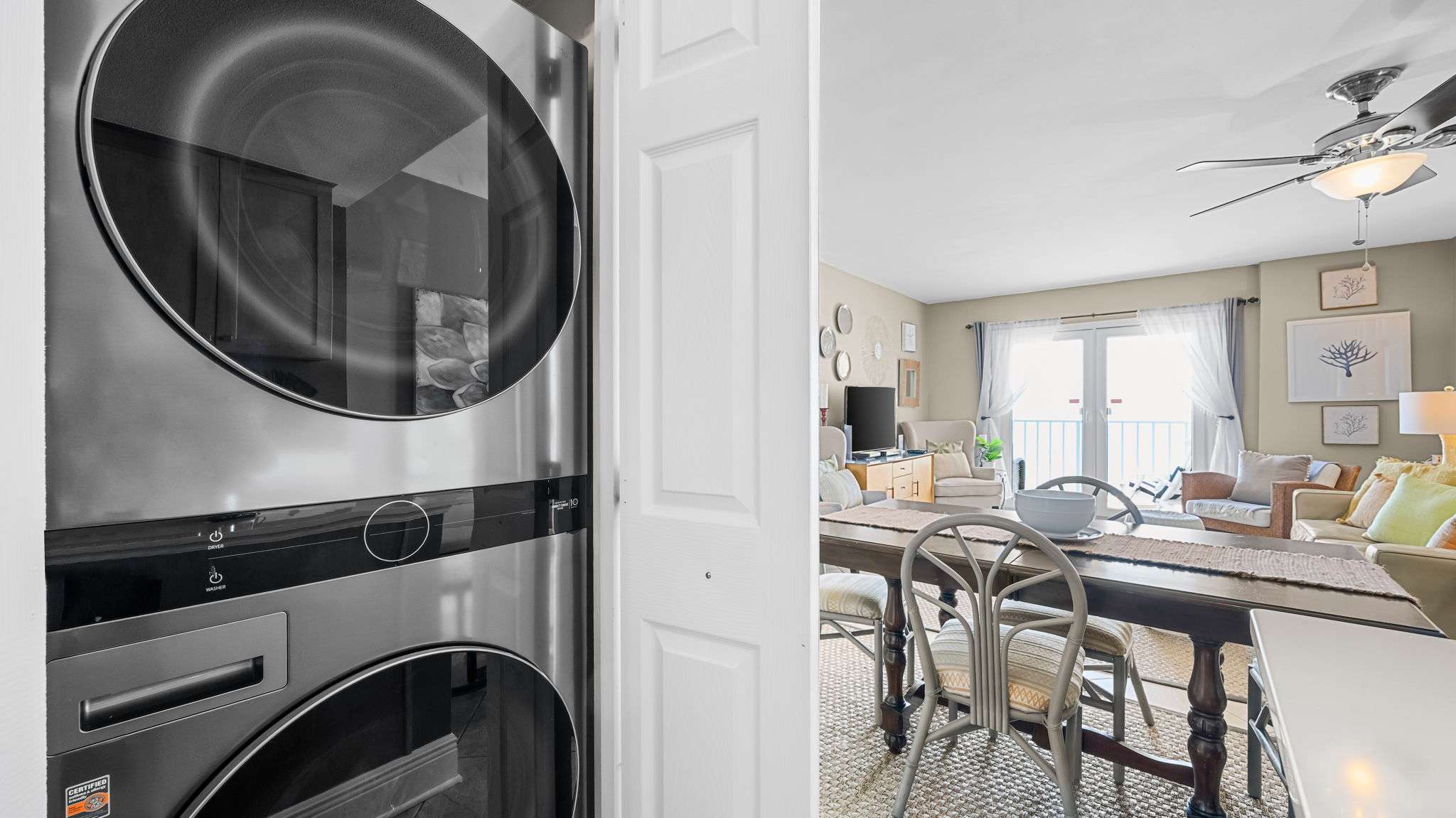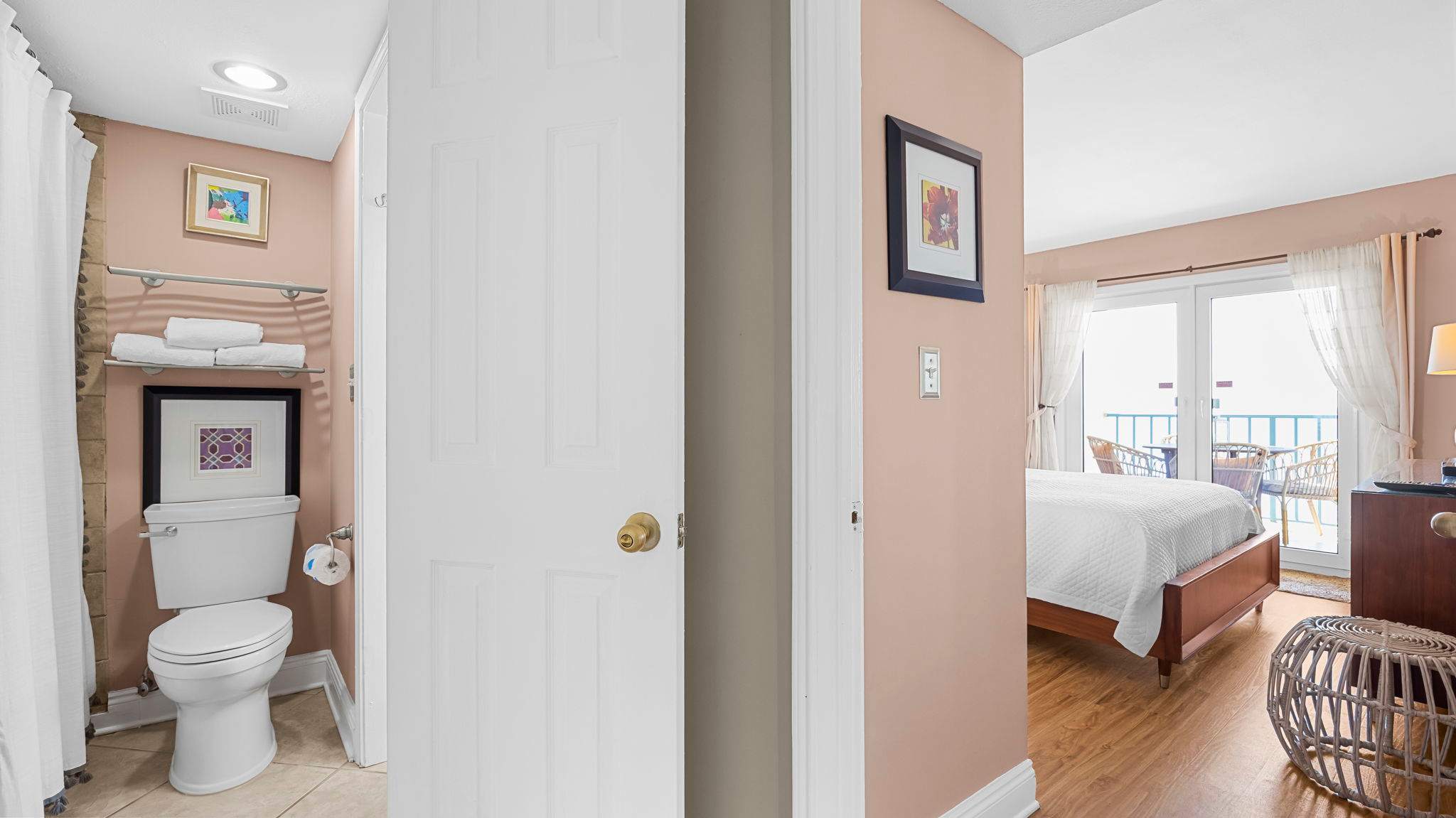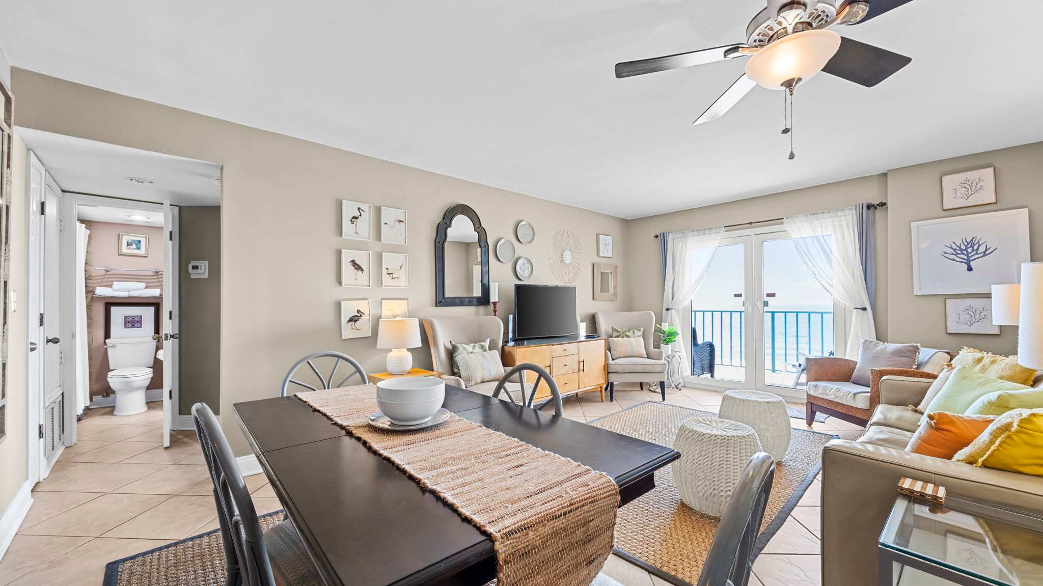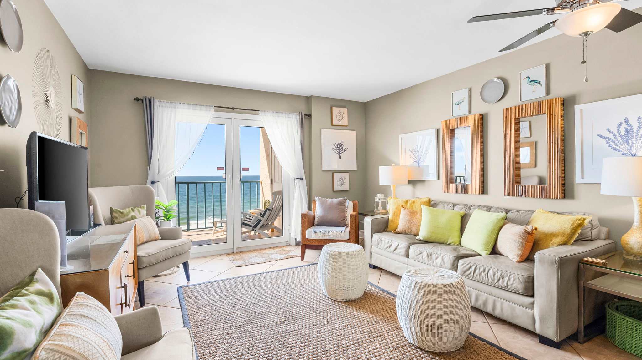 The living room invites you to unwind with comfortable seating, a large flat-screen TV, and direct access to a private Gulf-front balcony where you can sip your morning coffee while watching the waves roll in. The fully equipped kitchen has everything you need to prepare fresh seafood dinners or quick snacks between beach trips.