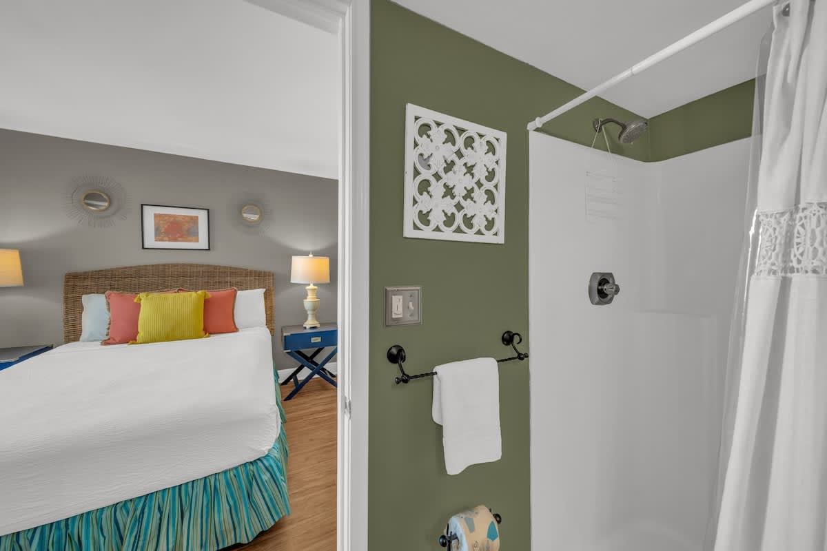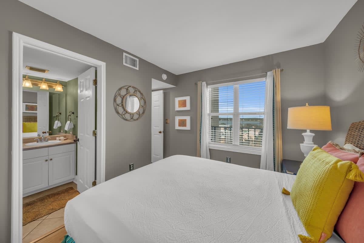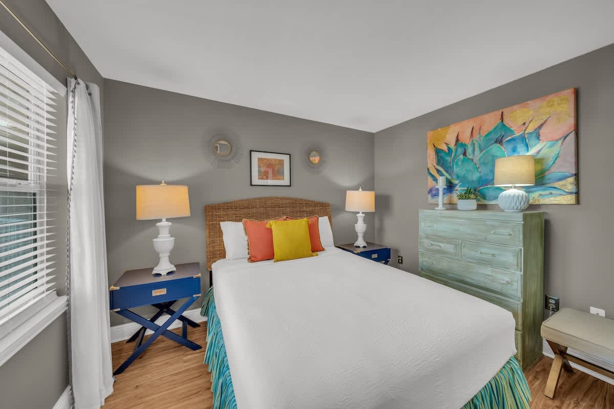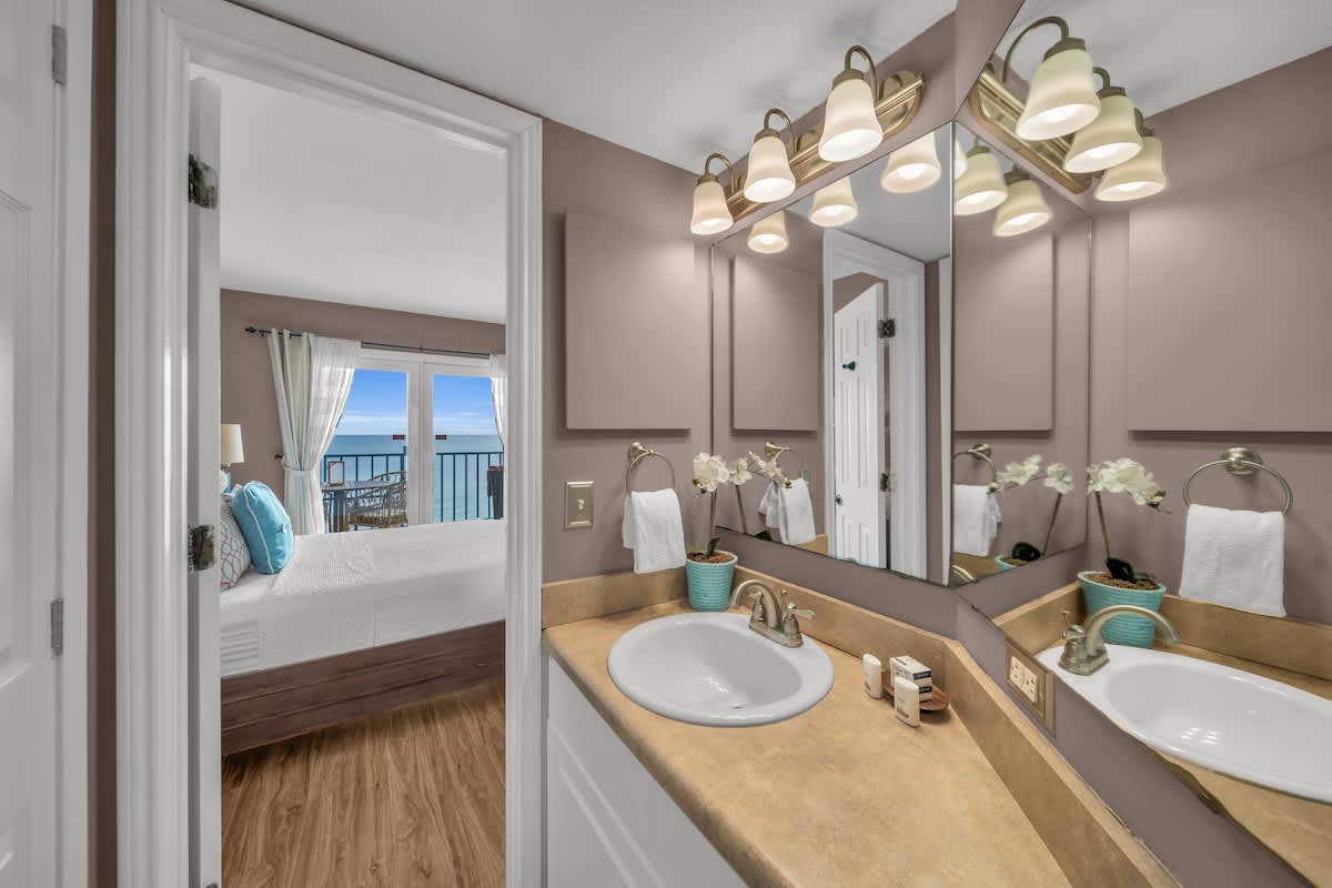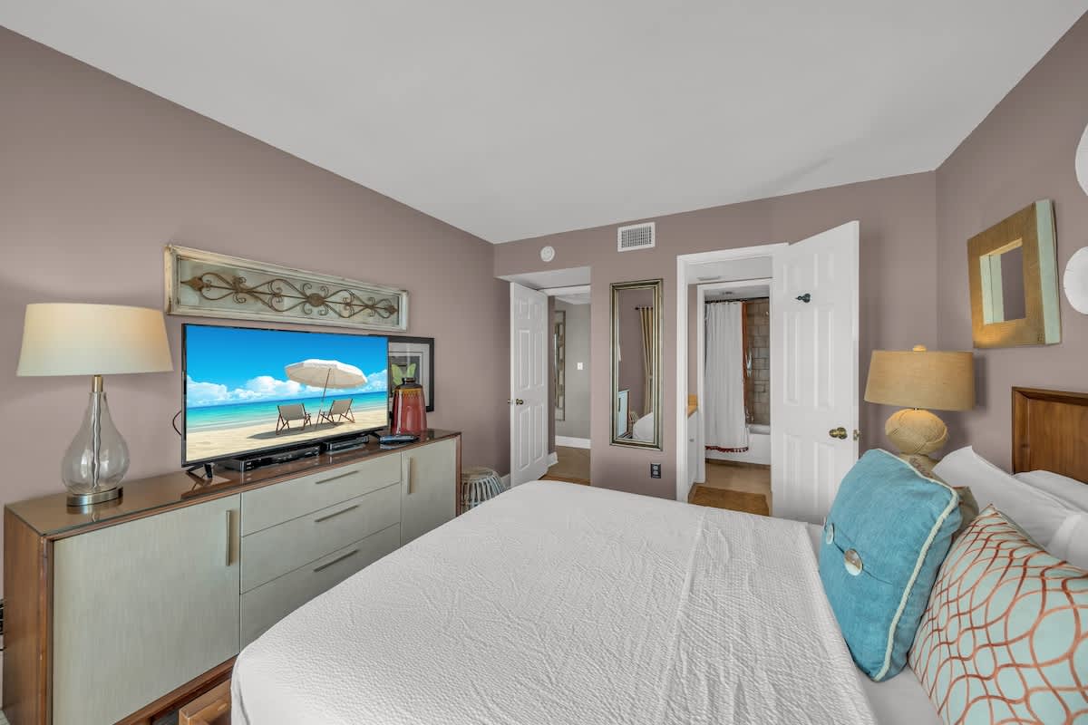 Both bedrooms feature queen beds with plush linens, providing a peaceful retreat after a long day in the sun. The primary suite has its own private bath, while the second full bathroom ensures everyone has plenty of space.