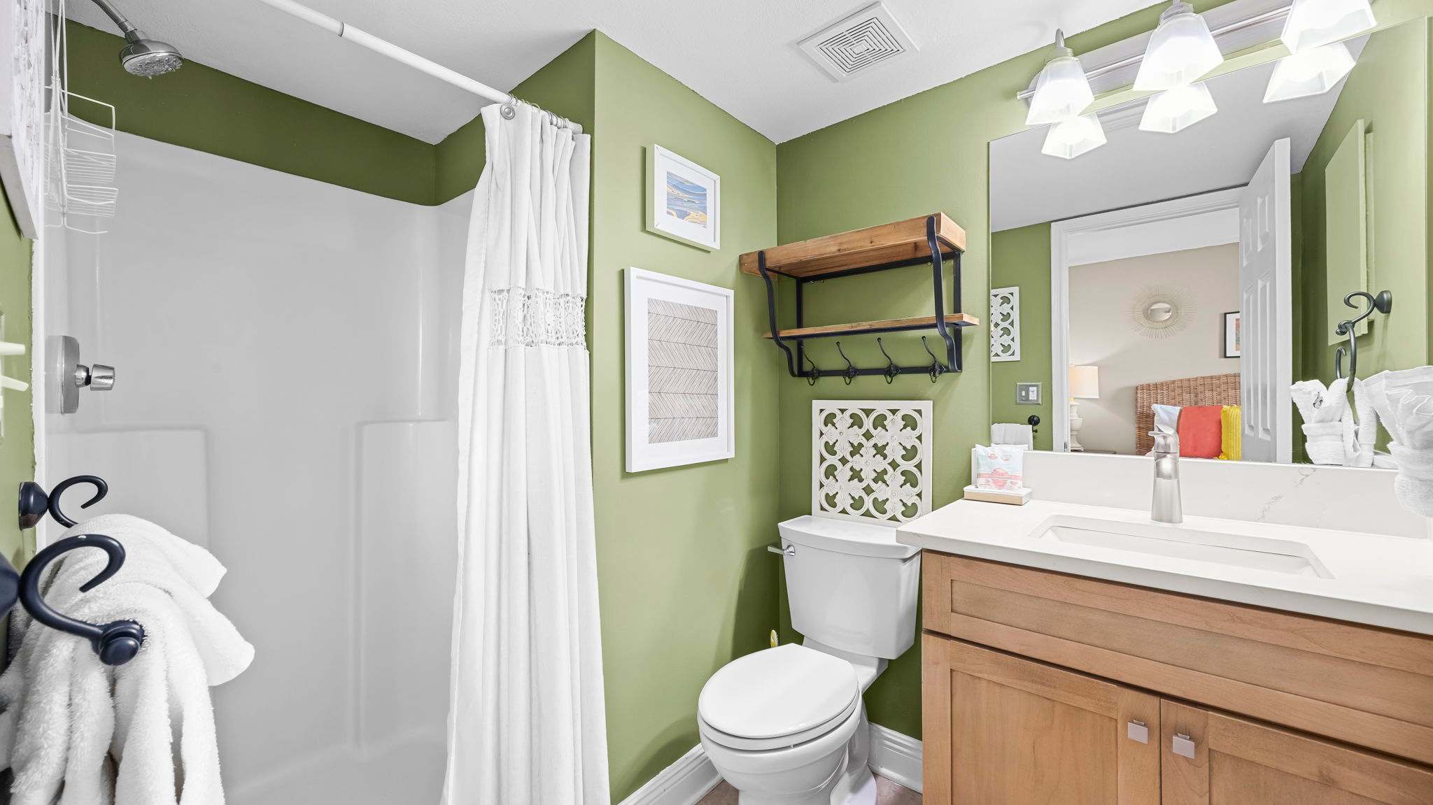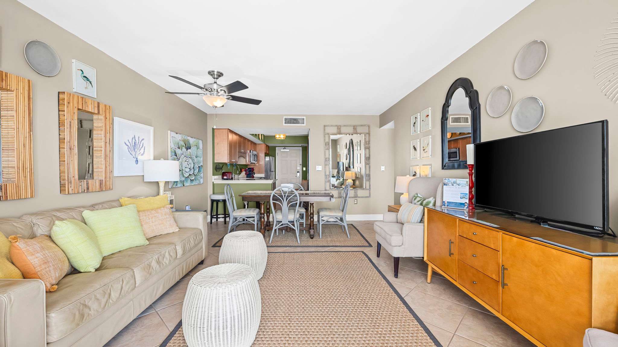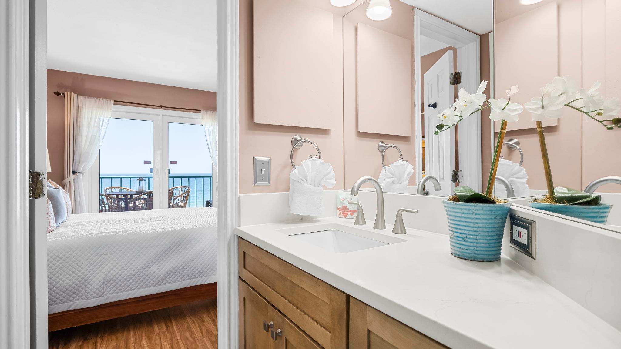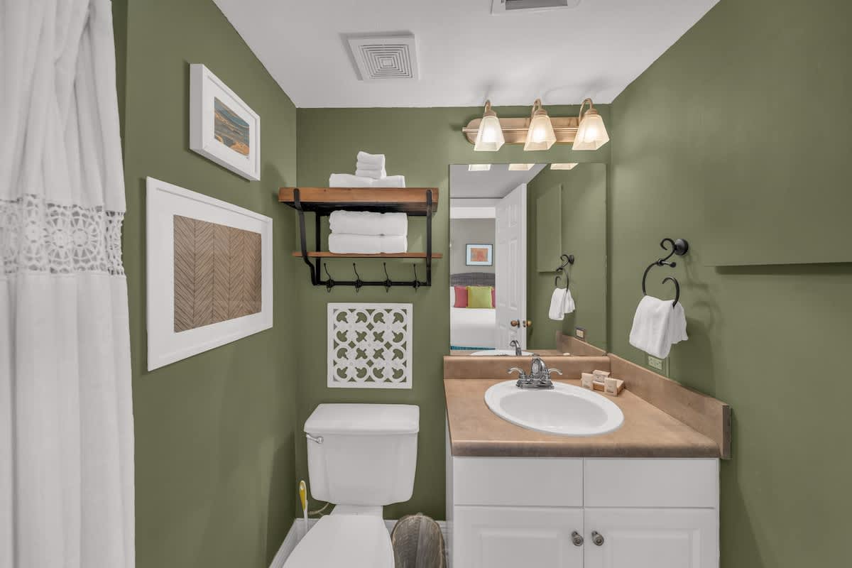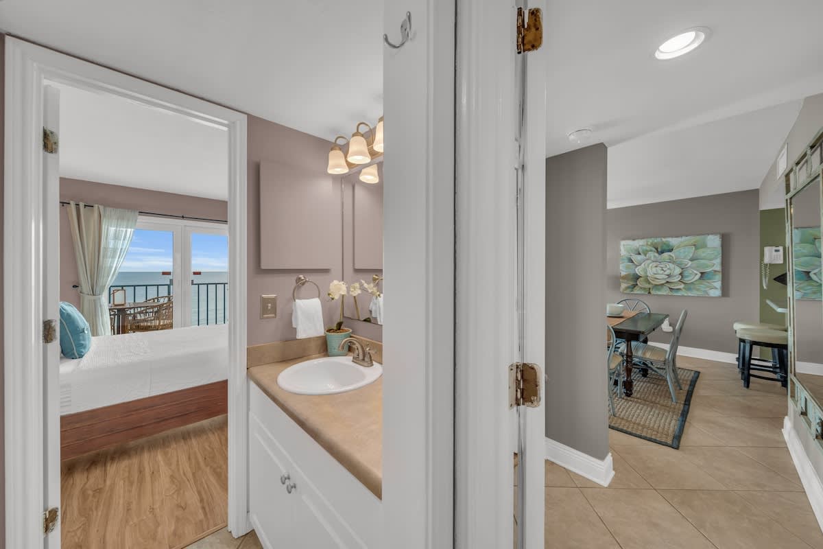 Both bedrooms feature queen beds with plush linens, providing a peaceful retreat after a long day in the sun. The primary suite has its own private bath, while the second full bathroom ensures everyone has plenty of space.
