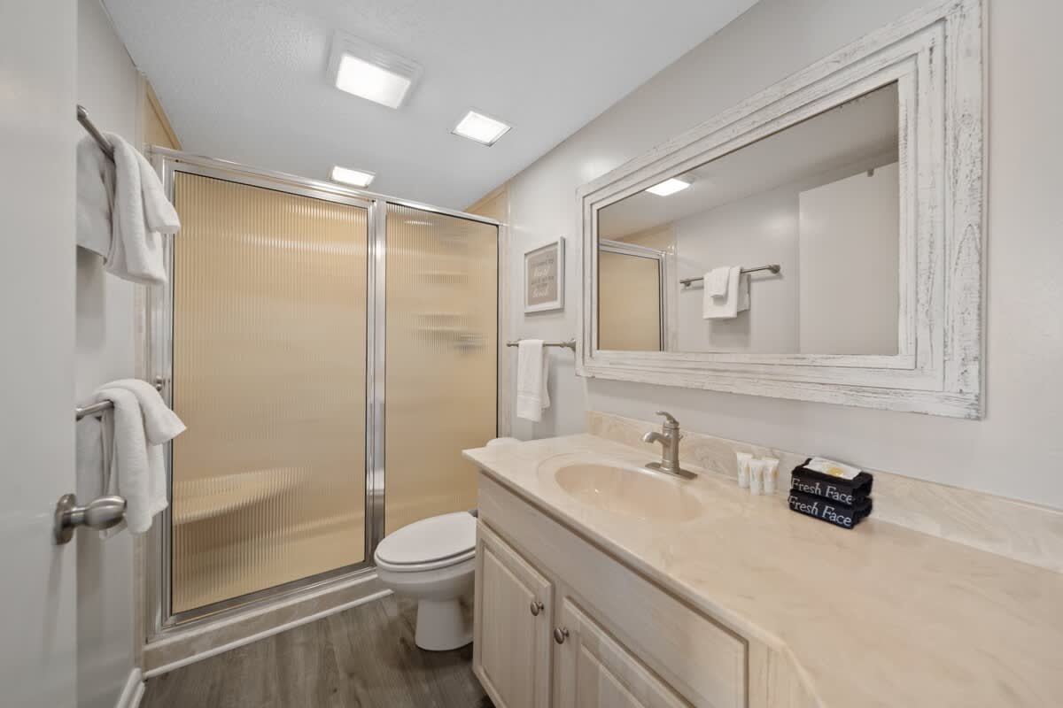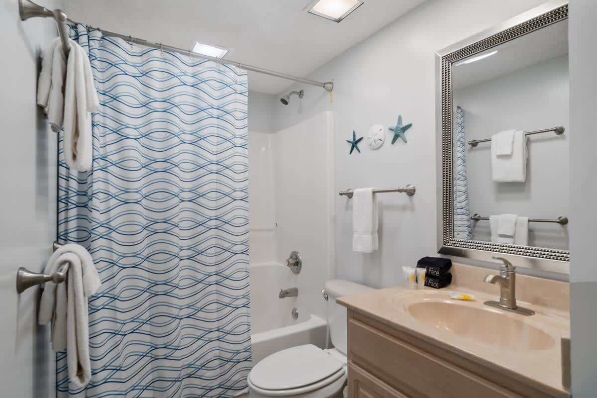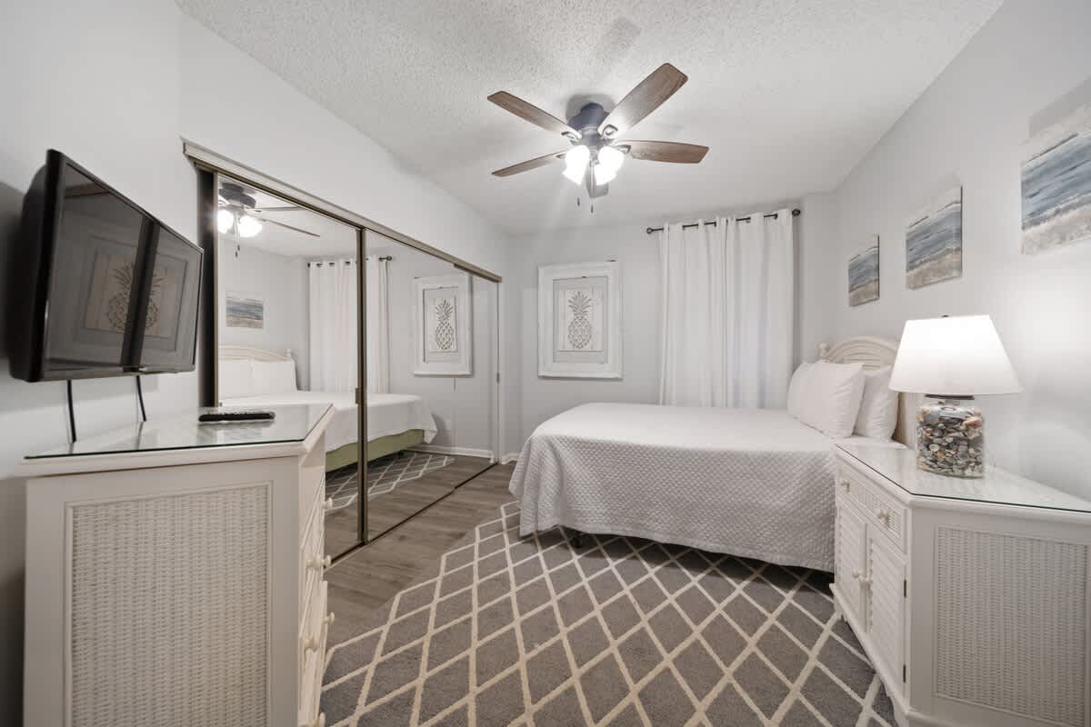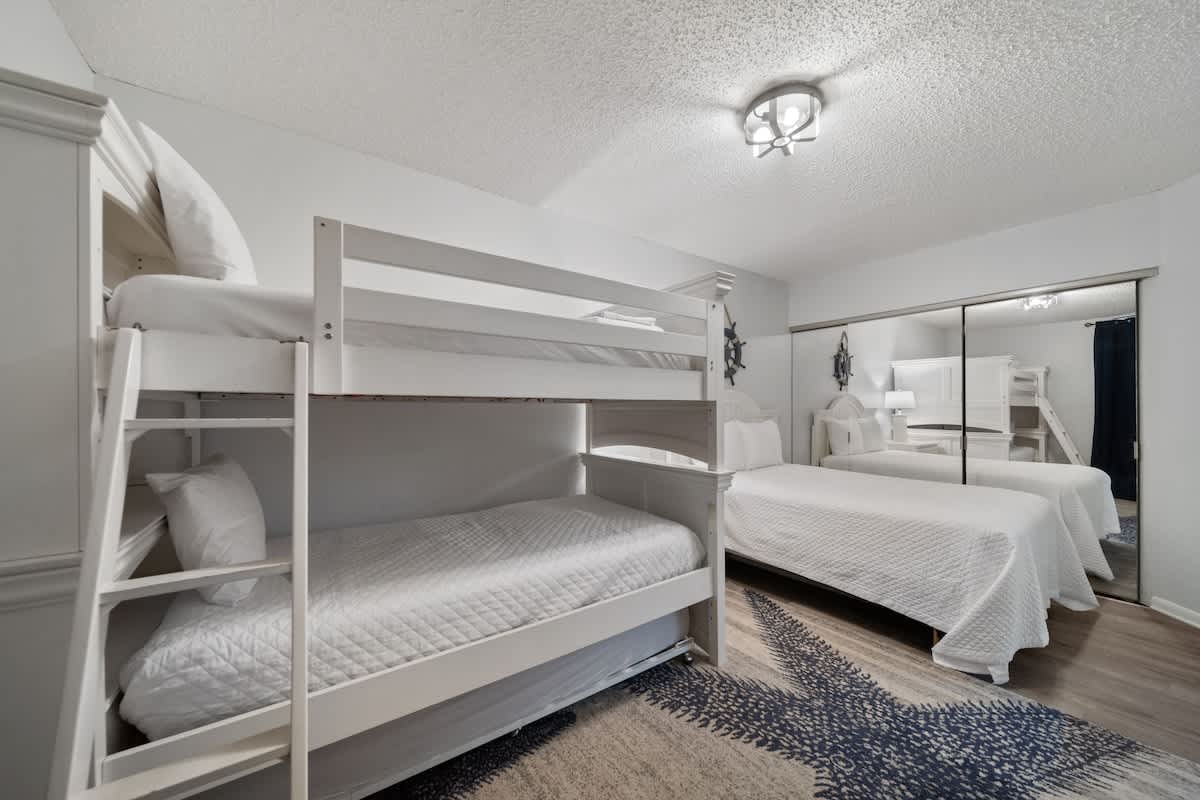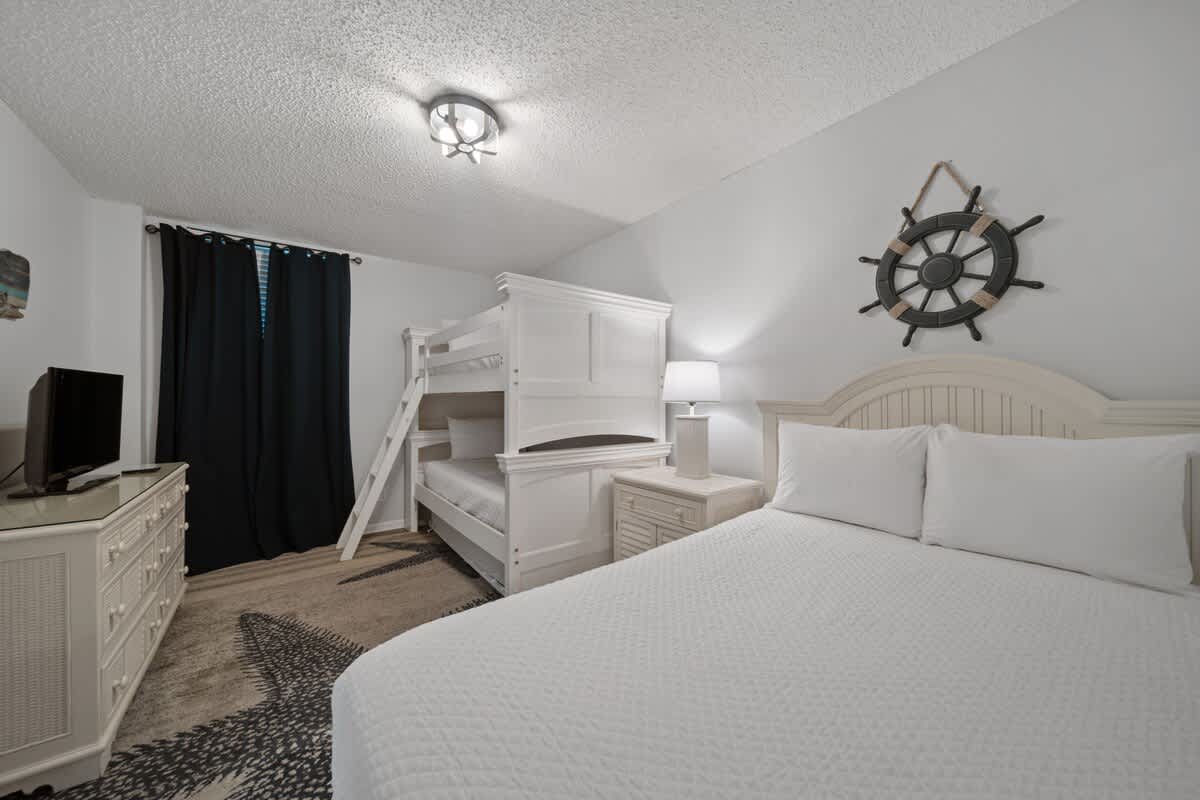 This sweet retreat has three dreamy bedrooms, each designed for ultimate comfort. The primary suite is a Gulf-front haven with a king-sized bed, private patio access, and an en-suite bath—hello, relaxation station! The second bedroom features a queen-sized bed, while the bunk room is a hit with the groms, featuring a twin over twin bunk and an extra double bed ready for adventure dreams. Each room has its own TV, so everyone can unwind their way.