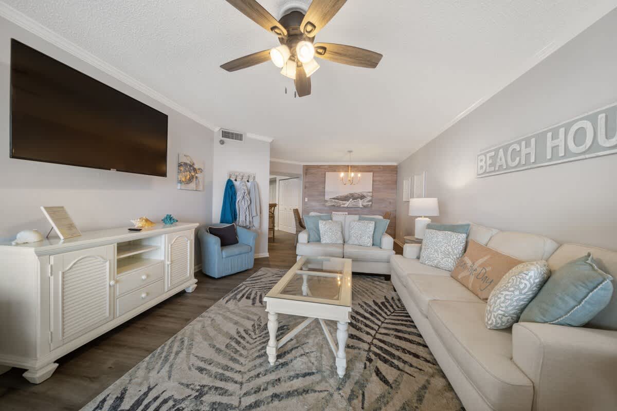 The living room is the definition of cozy-chic, decked out with plush sofas, nautical accents, and a big ol’ flat-screen TV perfect for movie nights after a day in the waves. Floor-to-ceiling sliding glass doors let in endless sunshine and lead right to the oversized patio—your personal slice of paradise with plenty of seating for sunset sips and salty-air lounging.