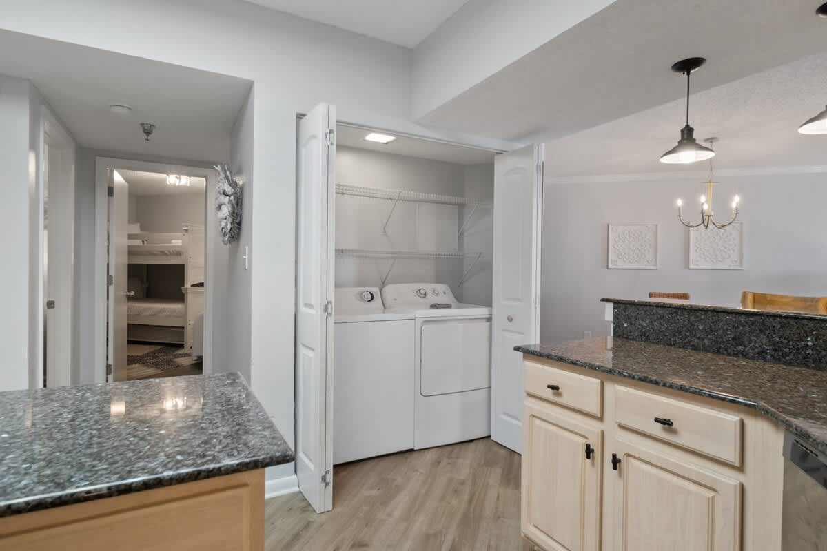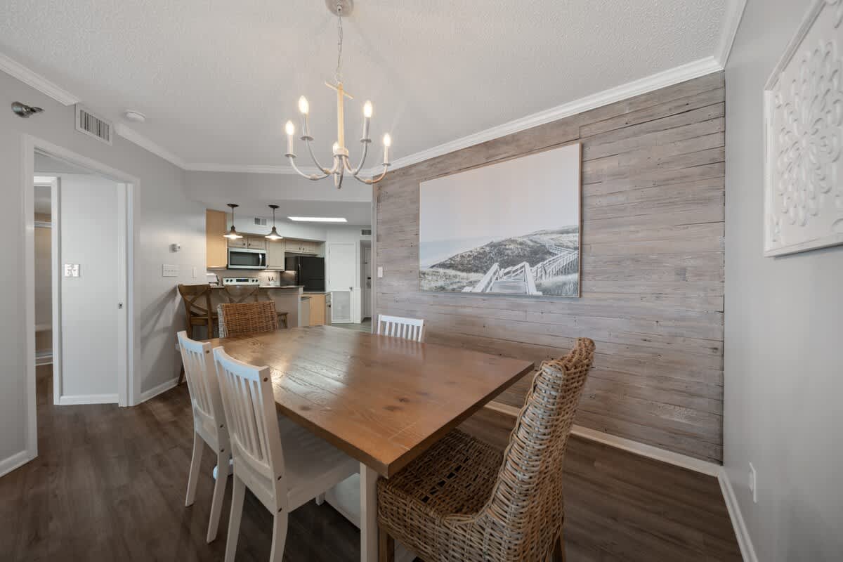 The kitchen? Oh, it’s got style AND function. Granite countertops, stainless steel appliances, and all the gadgets you need to whip up a seafood feast or a quick beach-day snack. Whether you're brewing up some morning coffee or blending up an afternoon daiquiri, this kitchen’s got you covered. The dining area, with its natural wood tones and beachy decor, is the perfect spot to gather the crew for a laid-back meal.